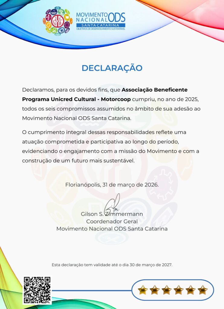 O MotorCoop celebra mais um marco importante em sua trajetória de responsabilidade social: a renovação, em 2025, do Selo Signatário do Movimento Nacional ODS Santa Catarina.
